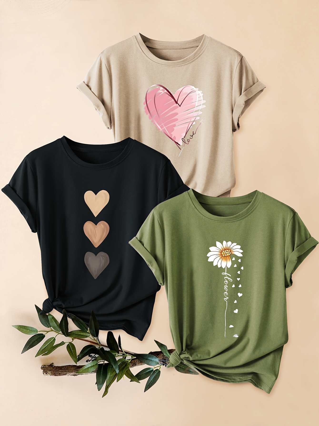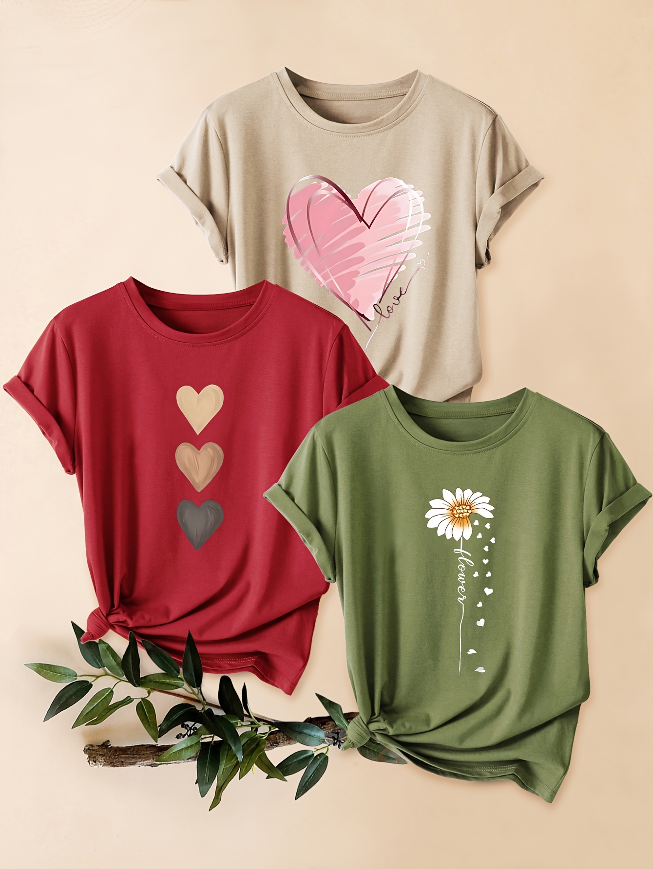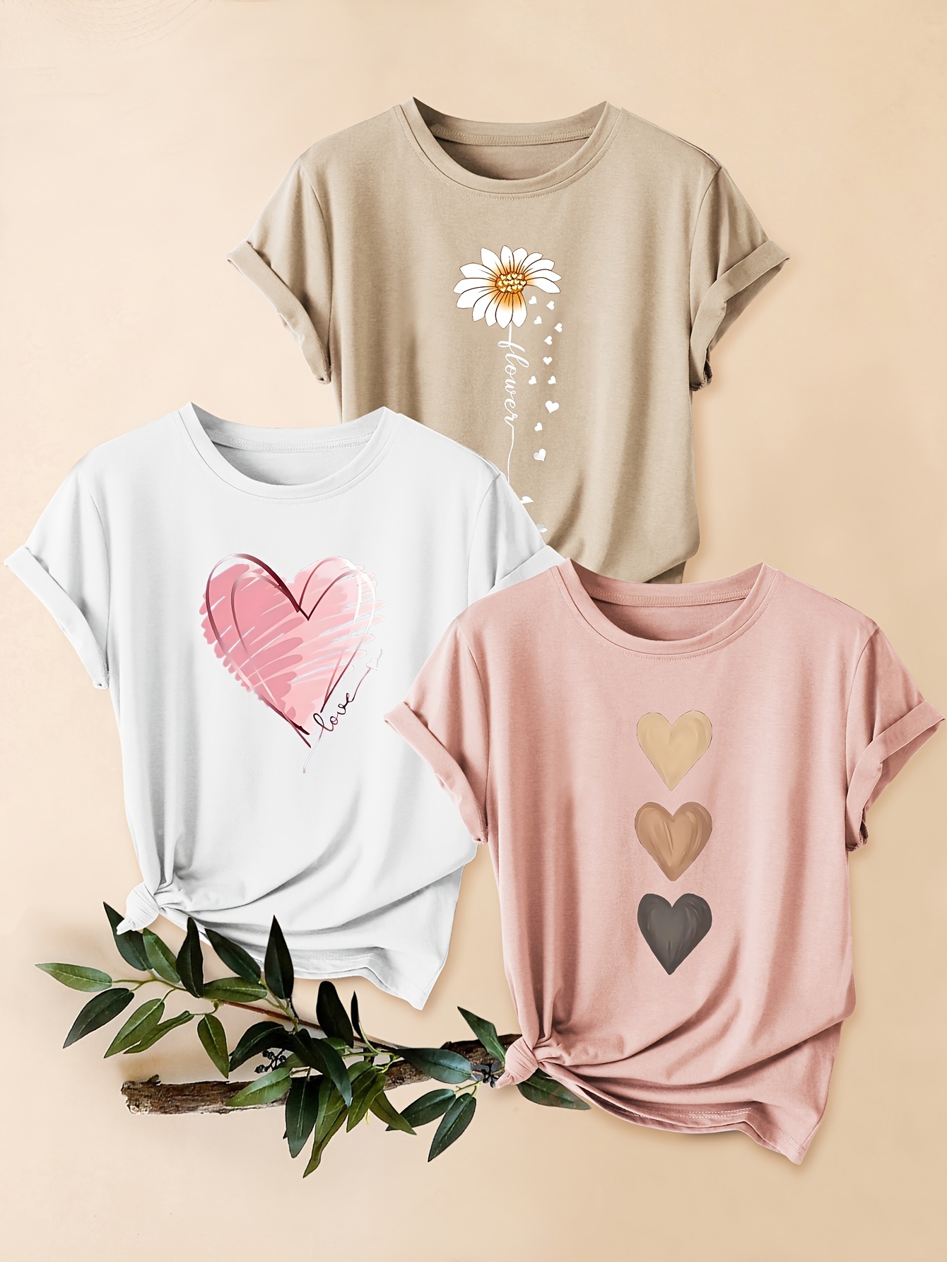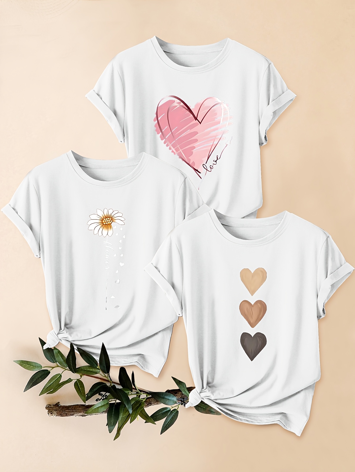 Three-Pack Wild Chrysanthemum Heart Print Fashion Vintage Women’s Casual Sporty Round Neck Short Sleeve T-Shirt
