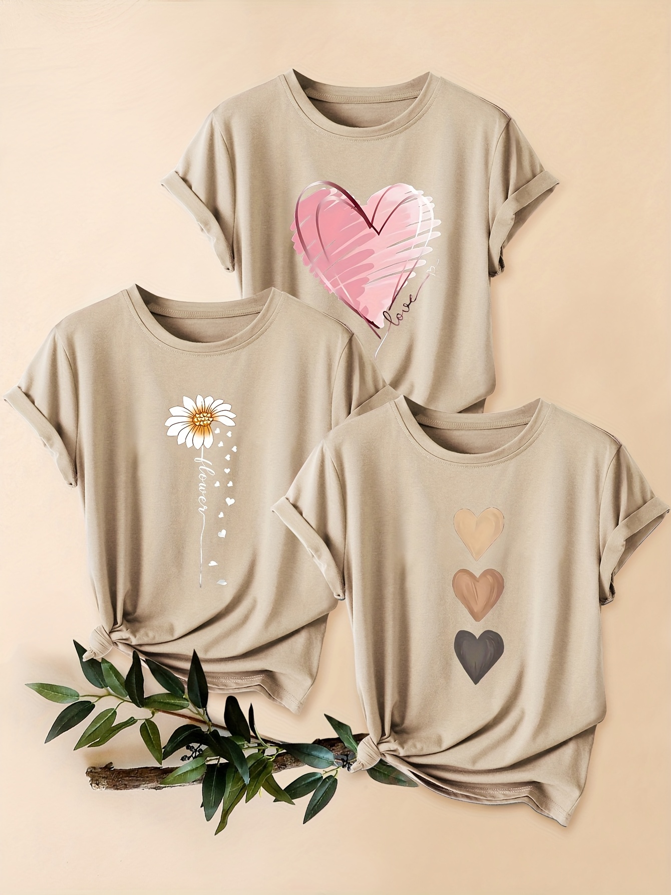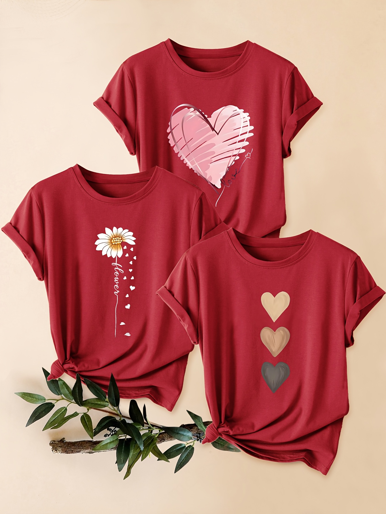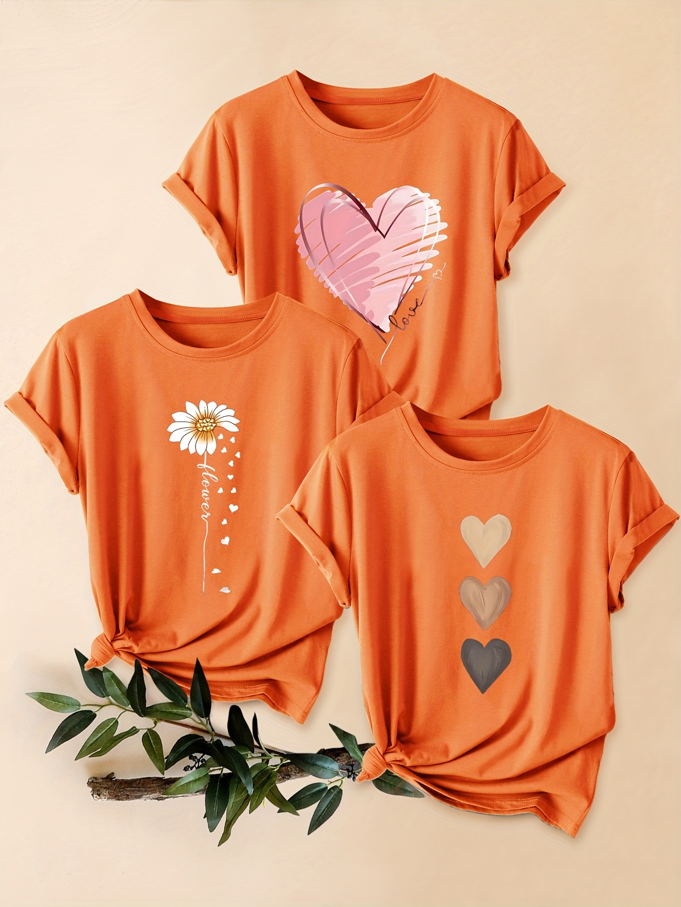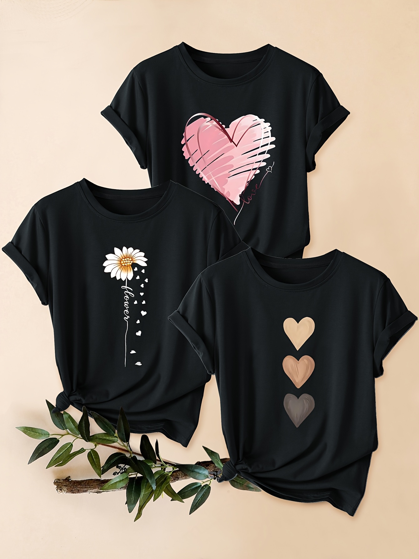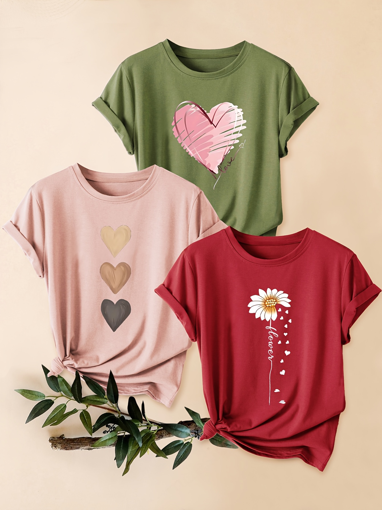 Three-Pack Wild Chrysanthemum Heart Print Fashion Vintage Women’s Casual Sporty Round Neck Short Sleeve T-Shirt